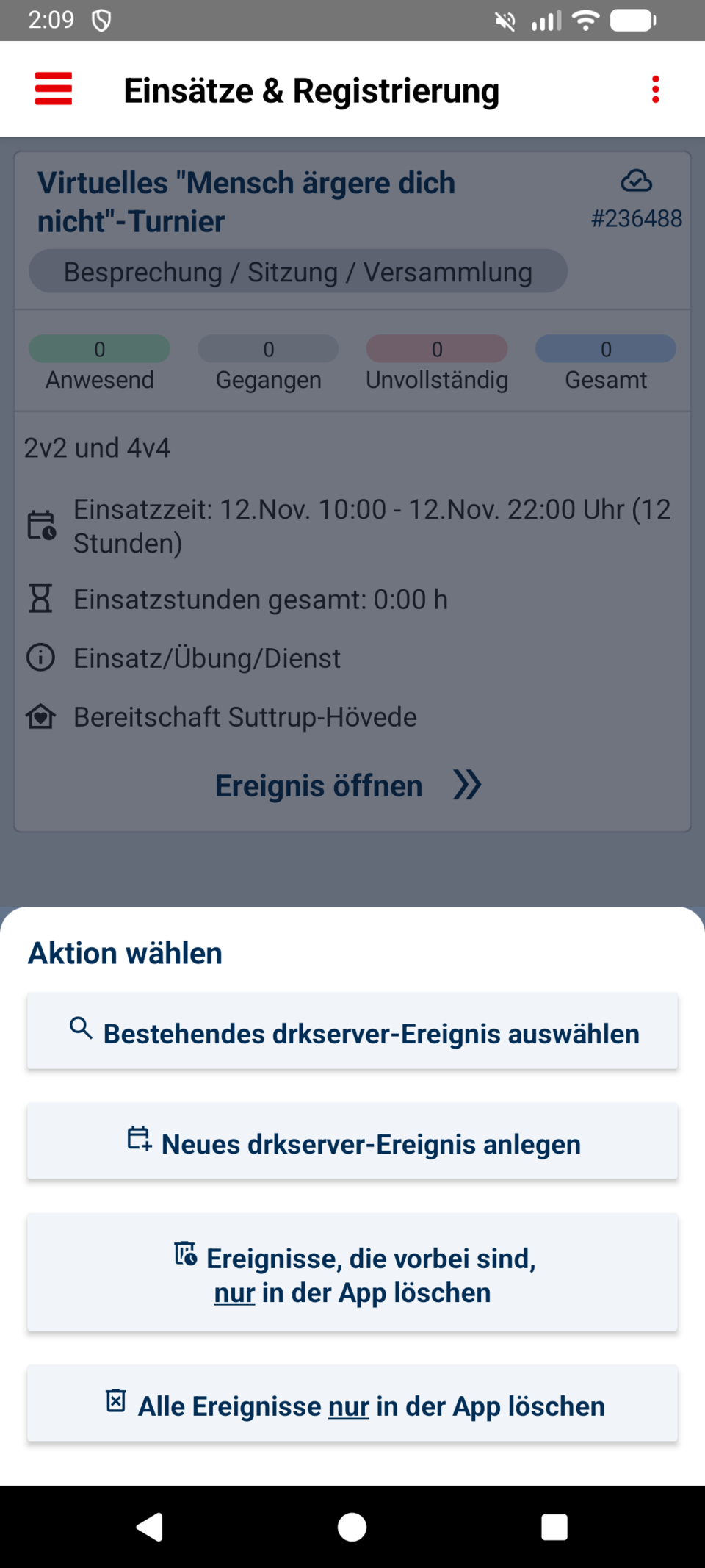 Dass das Wort „nur“ unterstrichen ist, hat seinen Grund: Im drkserver selbst bleiben die Ereignisse erhalten. Du löschst die Ereignisse aus der „DRK Hier!“-App, um in der App Ordnung zu schaffen.