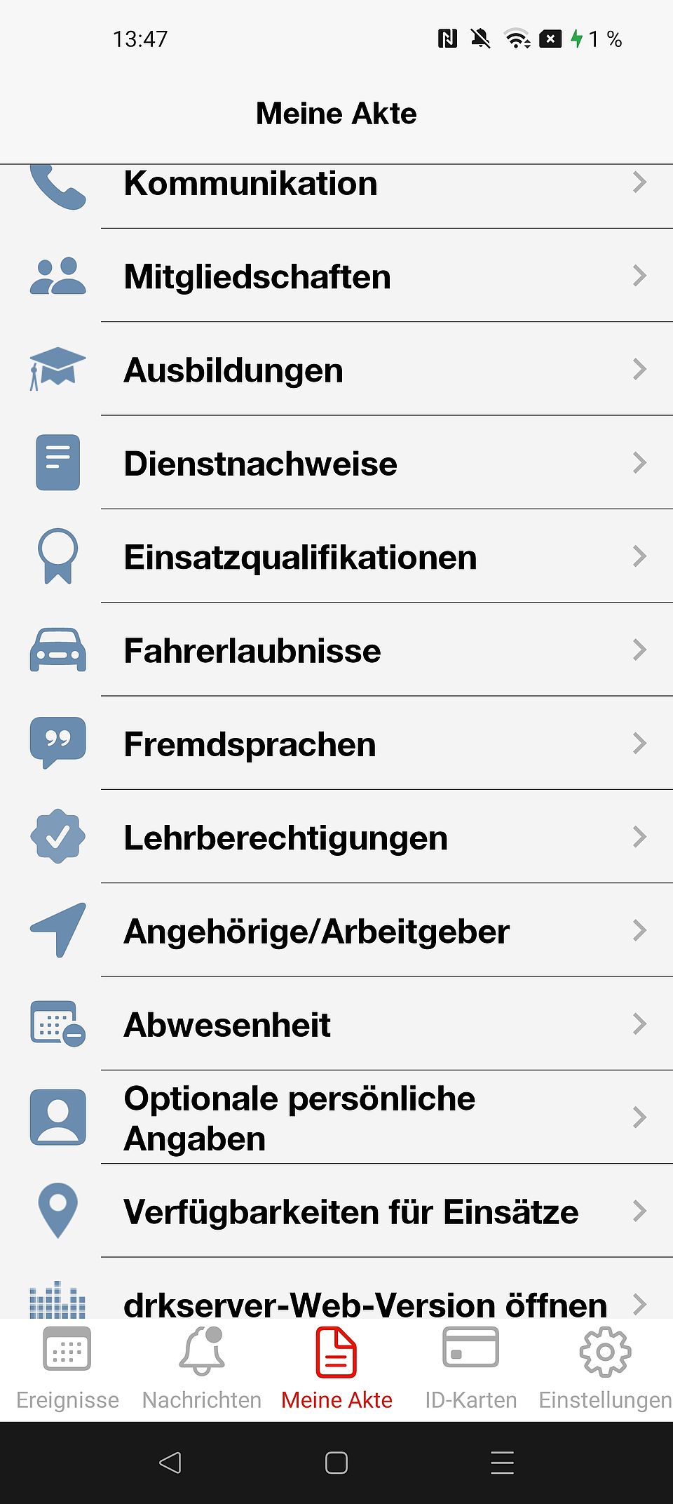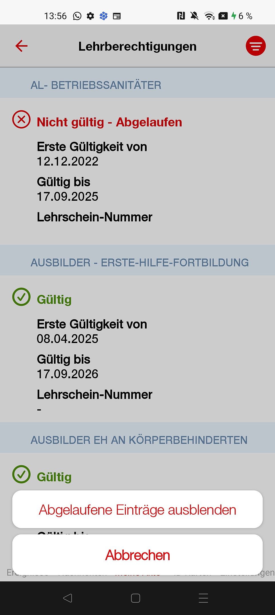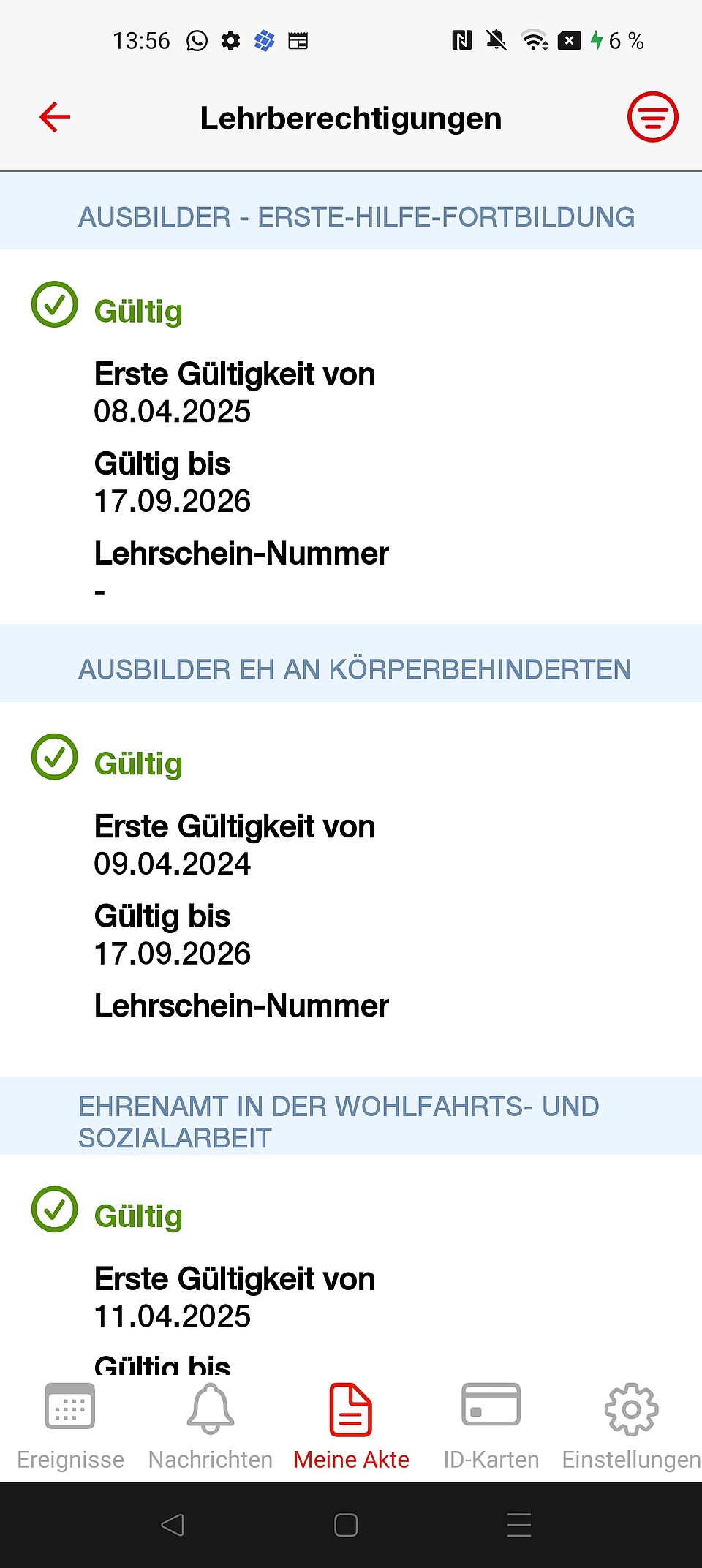 Unter "Meine Akte" findest du zwischen "Fremdsprachen" und "Angehörige/Arbeitgeber" jetzt eine neue Zeile namens "Lehrberechtigung". Wenn du darauf tippst, siehst du alle deine gültigen Lehrberechtigungen.