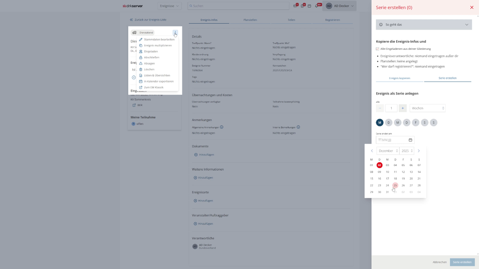 Ereignisse in Serie: Das Ereignismanagement Serientermine soll es dir einfacher machen, wiederkehrende Ereignisse schnell zu planen. Der Schwerpunkt liegt bei kleinen bis mittleren Diensten, Einsätzen und Veranstaltungen, die meist auf Orts- und Kreisverbandsebene stattfinden.